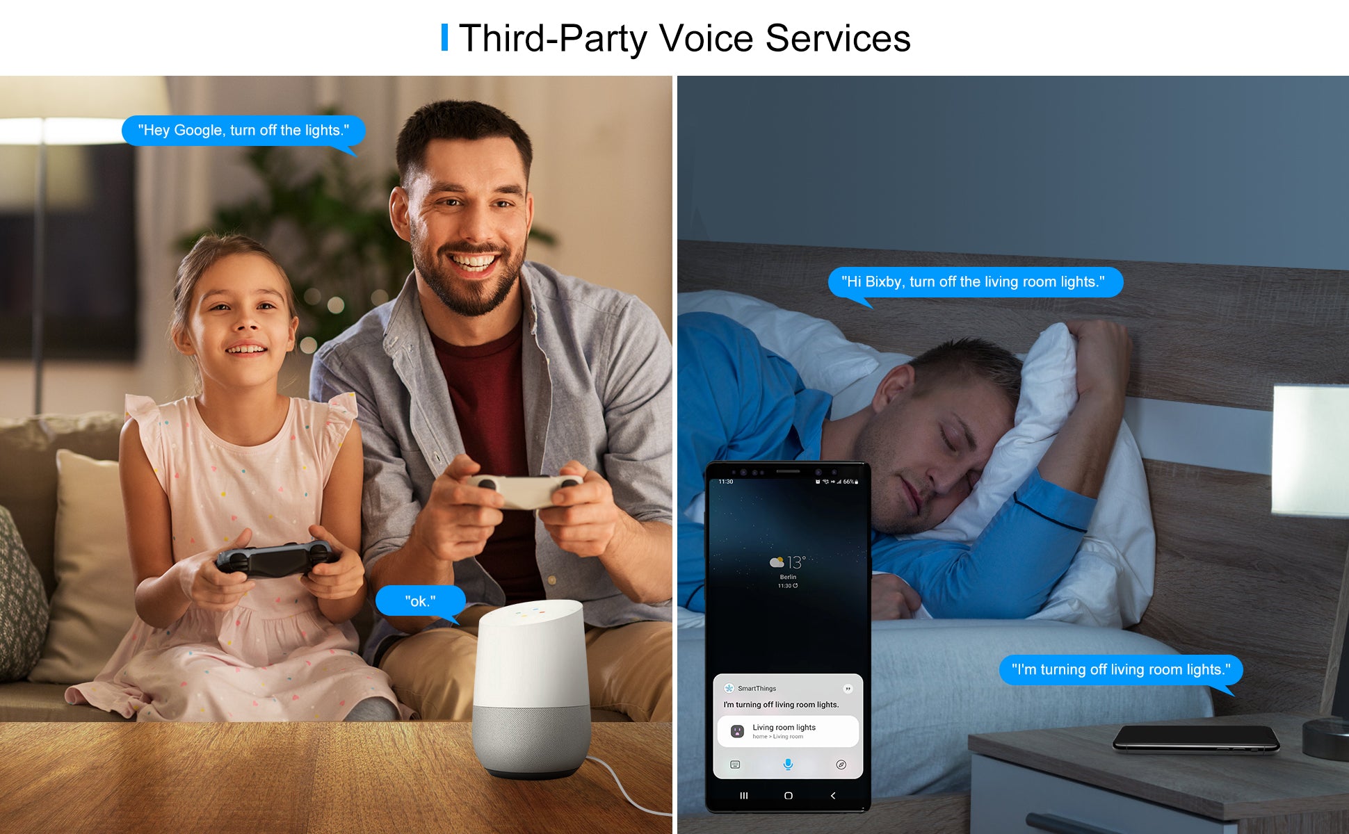 - Sprachsteuerung: Kompatibel mit Google Home, Amazon Alexa und Samsung SmartThings. Lassen Sie die Sprachassistenten Ihre Geräte steuern.