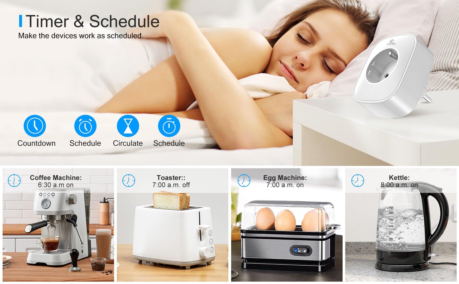 - APP-Steuerung: Schalten Sie Ihre Haushaltsgeräte in regelmäßigen Abständen aus und steuern Sie sie aus der Ferne mit der Smart Life APP, um Strom zu sparen und gleichzeitig Sicherheit zu gewährleisten.